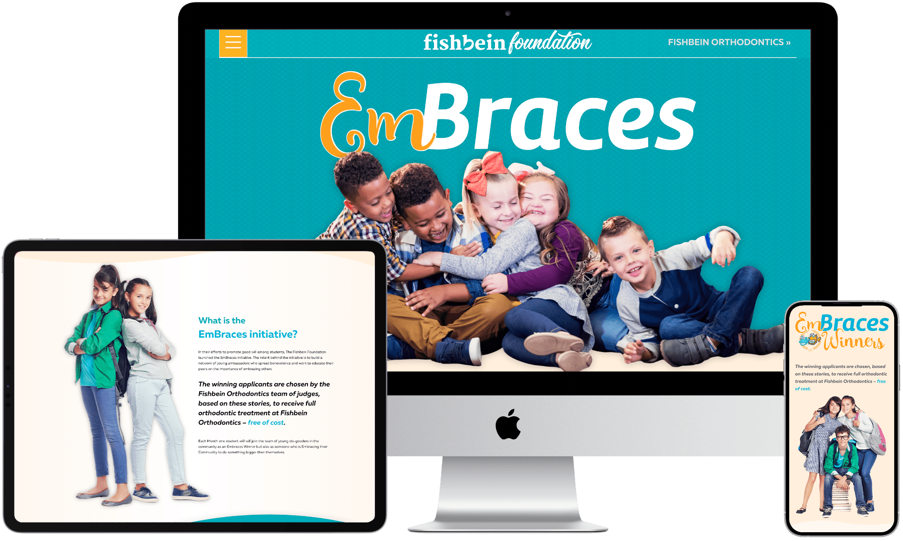 We started by developing the concept, name, logo and collateral for the EmBraces campaign. We also created a landing page on Fishbein Orthodontics’ website, as well as a blog post shared to social media to raise awareness.